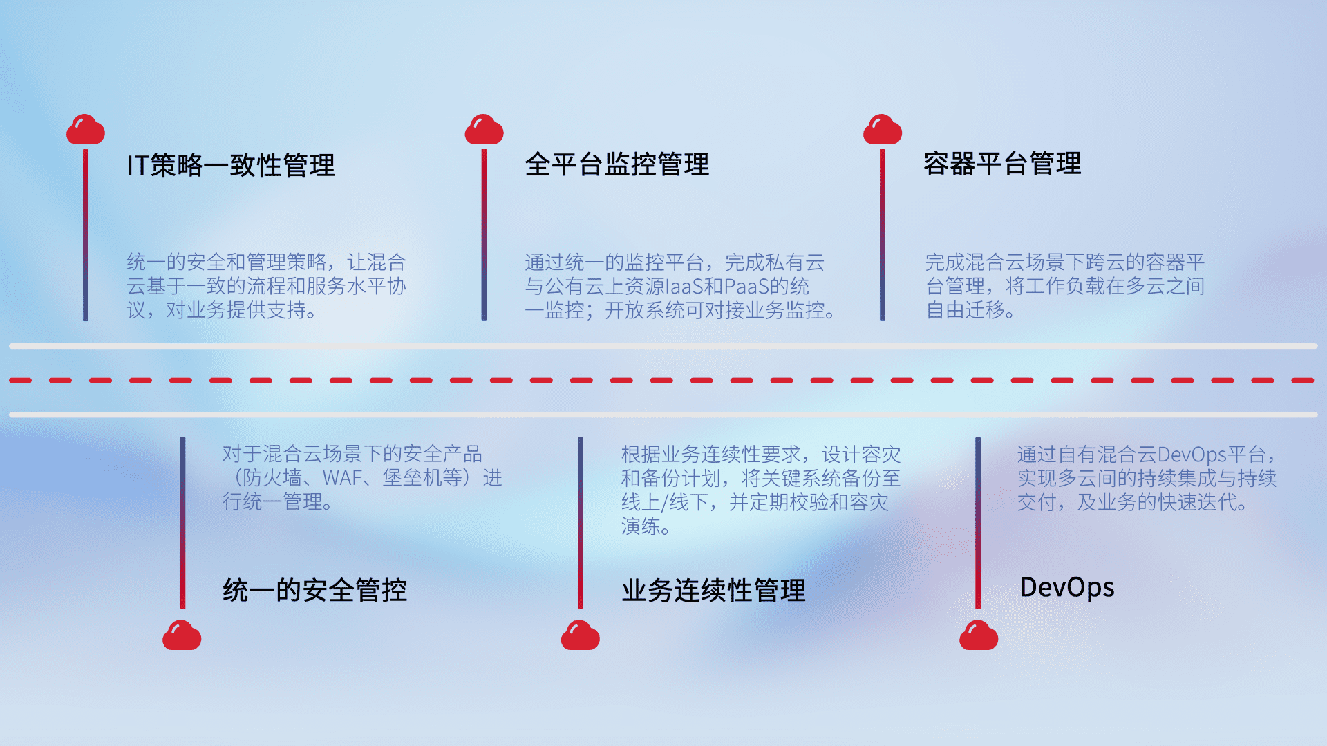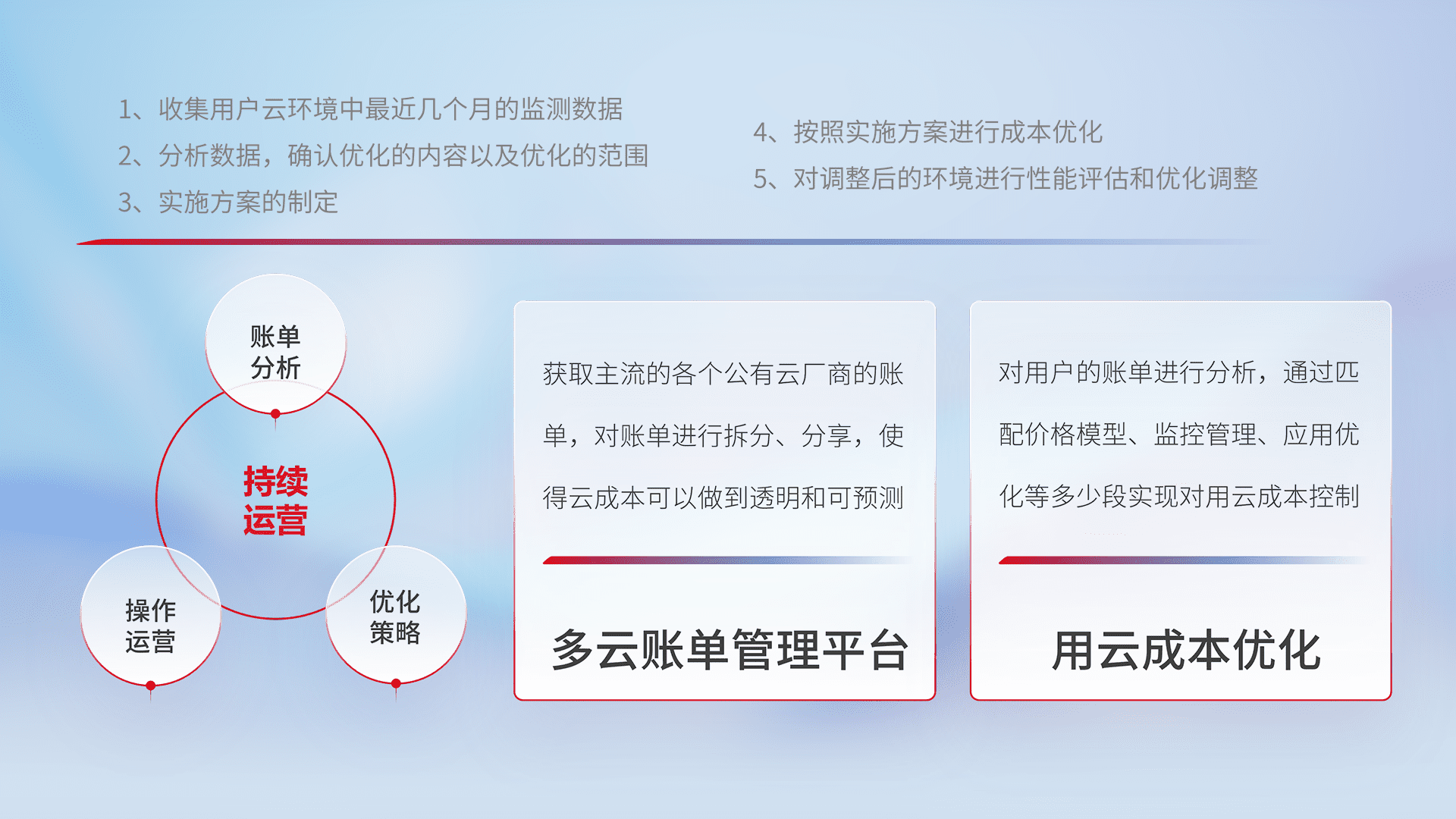 通过多云纳管,,,以统一的资源数据模型把客户的云资源进行抽象和封装,,,进而实现对多云资源的统一操作,,保障云资源管理的可靠性、、、、稳定性与可用性。。。。量身定制化运维内容,,配置、、、、开发运维、、、、补丁管理、、、备份、、监控、、认证和访问管理、、、审计和日常巡检等,,,,保障在用云过程中的可靠度,,,,稳定度以及高可用率。。