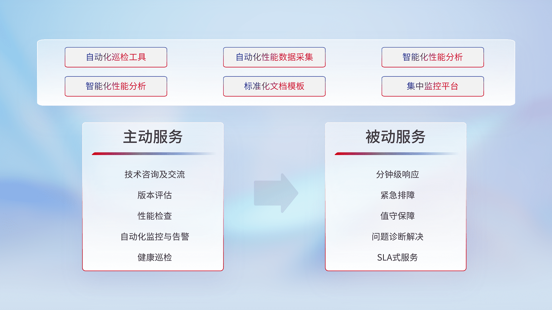 智能化工具和标准化文档,,,保障服务质量,,,提供主动服务(包含技术咨询、、版本评估、、、性能检查、、、、自动化监控与告警、、、、健康巡检)和被动服务包含(分钟级响应、、、紧急排障、、、、值守保障、、、、问题诊断解决、、、SLA服务)。。。。