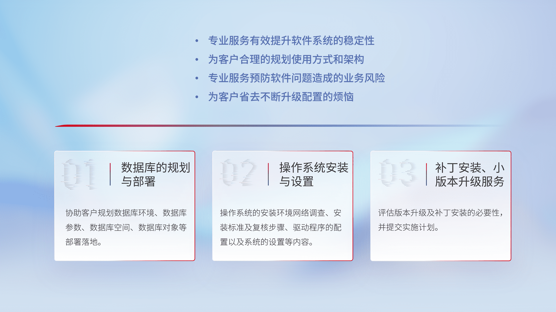 为客户提供软件规模升级、、、、快速部署、、、、按需配置的专业服务,,,,从数据库的规划与部署到操作系统的安装与设置,,,再到补丁安装和小版本升级提供支持。。